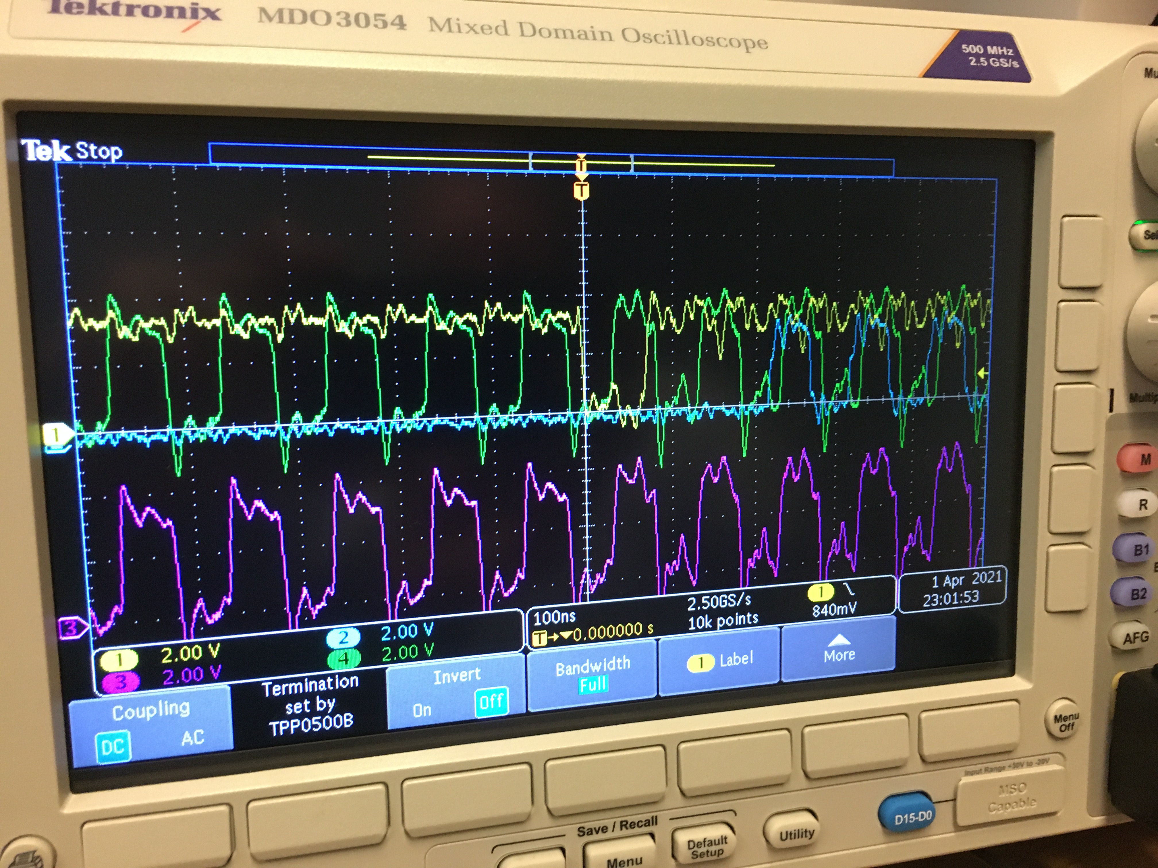 | 15 | P, P, P, R | Yellow trace shows DVALID of first board at J2, blue shows 12V of first board at J2, purple shows DCLK of third board J3, green shows 12V of fourth board at J3. Second image has yellow and purple showing DCLK of different boards (unsure which ones). | |